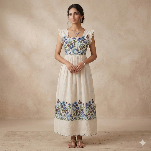 The Azure Blossom Fairy Frock is a graceful and charming outfit designed to capture elegance and comfort. Crafted in soft fabric with a gentle cotton lining, this dress features intricate floral embroidery on the yoke and hemline, highlighted with soothing blue and earthy tones. Delicate polka-dot accents scattered across the flare add a playful touch, while the embroidered floral border enhances its premium appeal. The sleeveless design with soft frill detailing at the neckline gives it a fairy-tale look, perfect for special moments. Wash Care & Maintenance