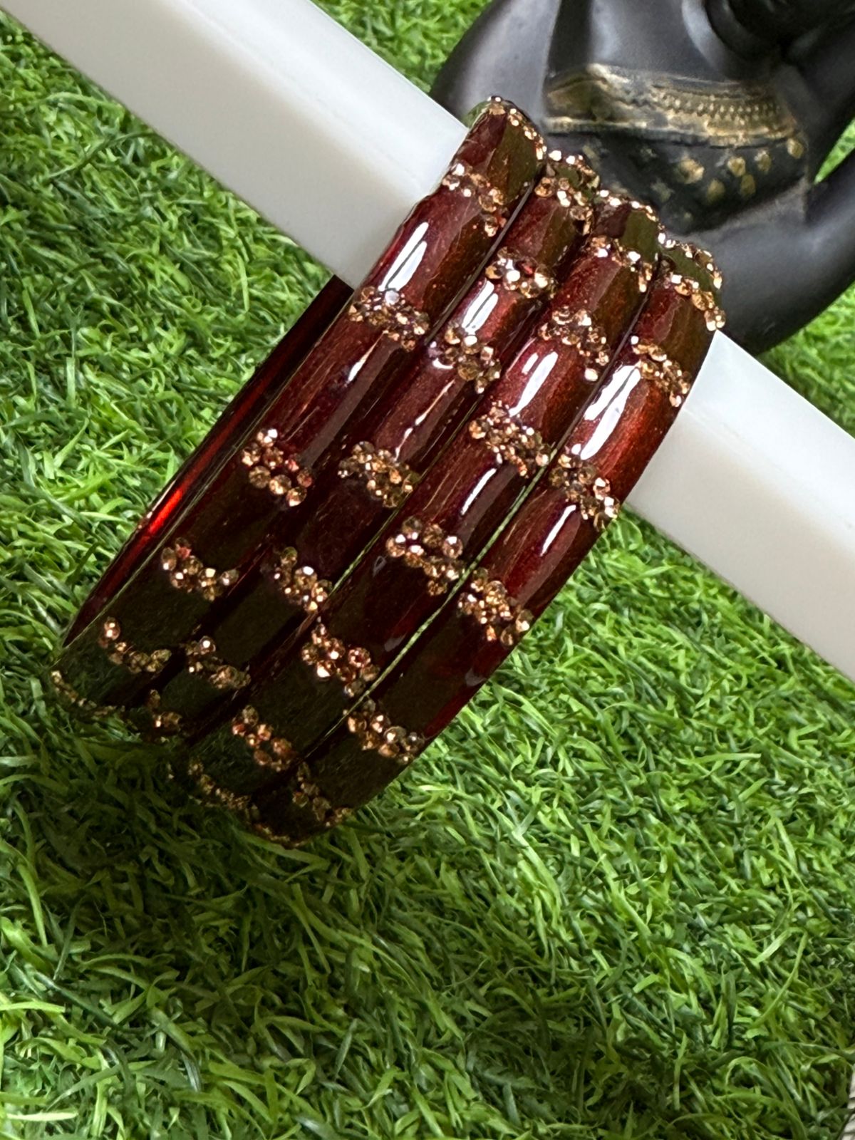 Description : These are a set of maroon glass bangles adorned with sparkling white and light pink rhinestones. The rhinestones are arranged in delicate patterns along the bangles, adding a touch of glamour and elegance to the traditional design. The deep maroon color gives the bangles a rich and sophisticated appearance, making them perfect for special occasions or adding a touch of ethnic flair to everyday outfits.