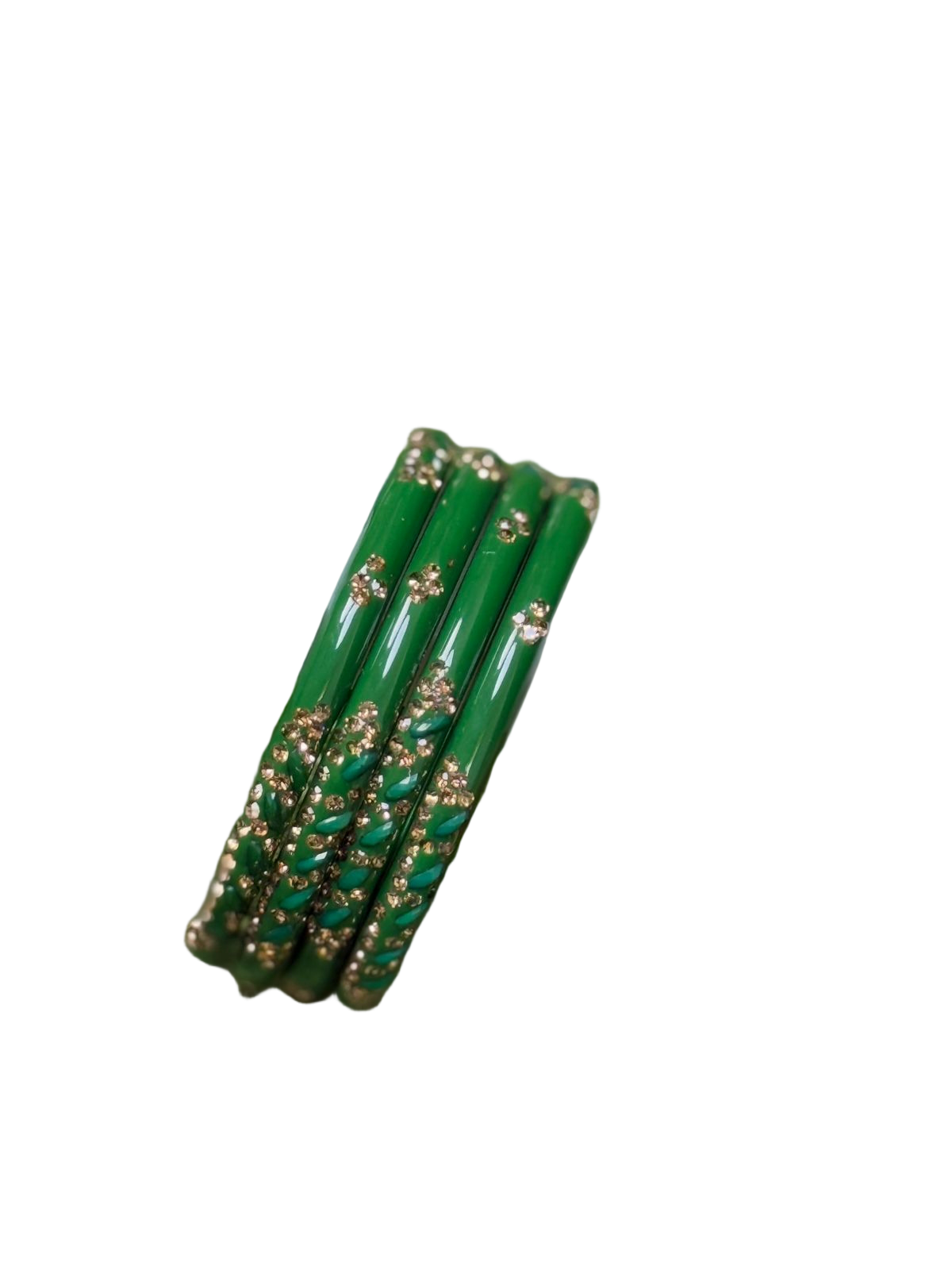 Description : These are a set of green glass bangles adorned with silver glitter detailing. The design features a delicate floral pattern in silver, adding a touch of elegance to the vibrant green colour of the bangles.