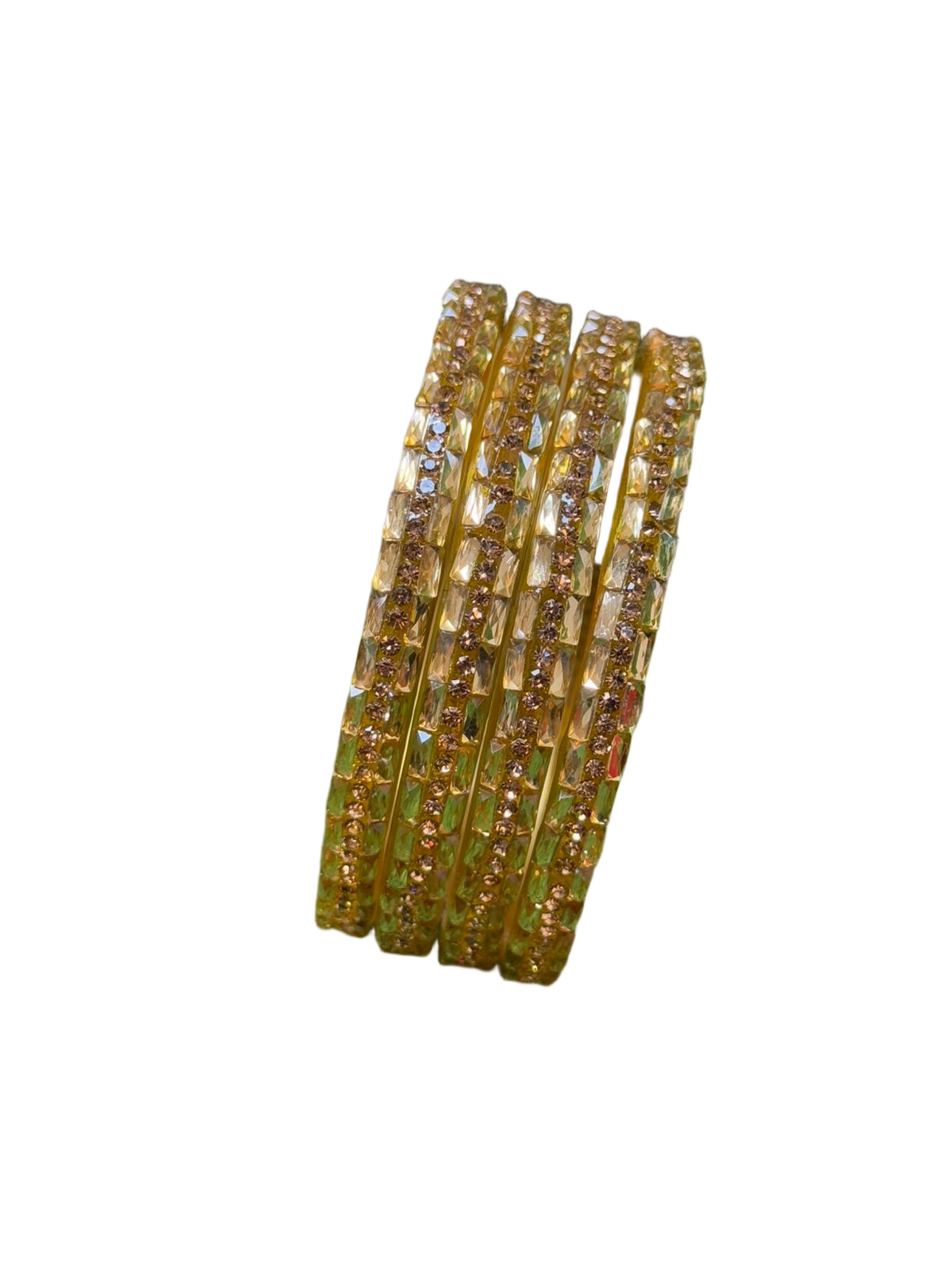 Description : These are a set of six gold-tone bangles adorned with sparkling white stones. They have a slightly textured or etched surface, giving them a glimmering effect. The bangles appear to be thin and lightweight, perfect for stacking together for a fashionable layered look.