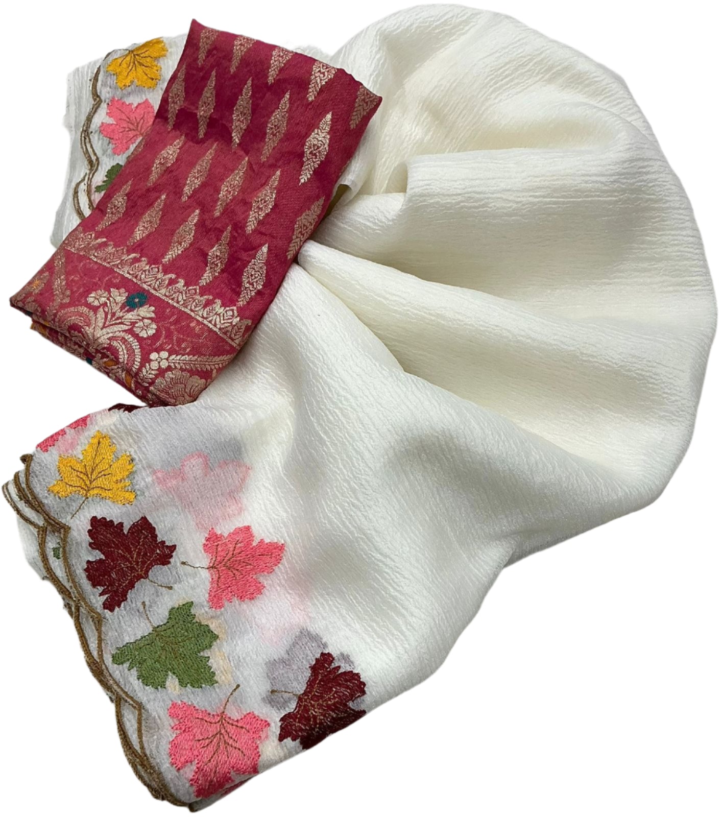 Design: The saree features multi-colored leaf embroidery on the pallu. The saree has a scalloped edge with golden detailing.
