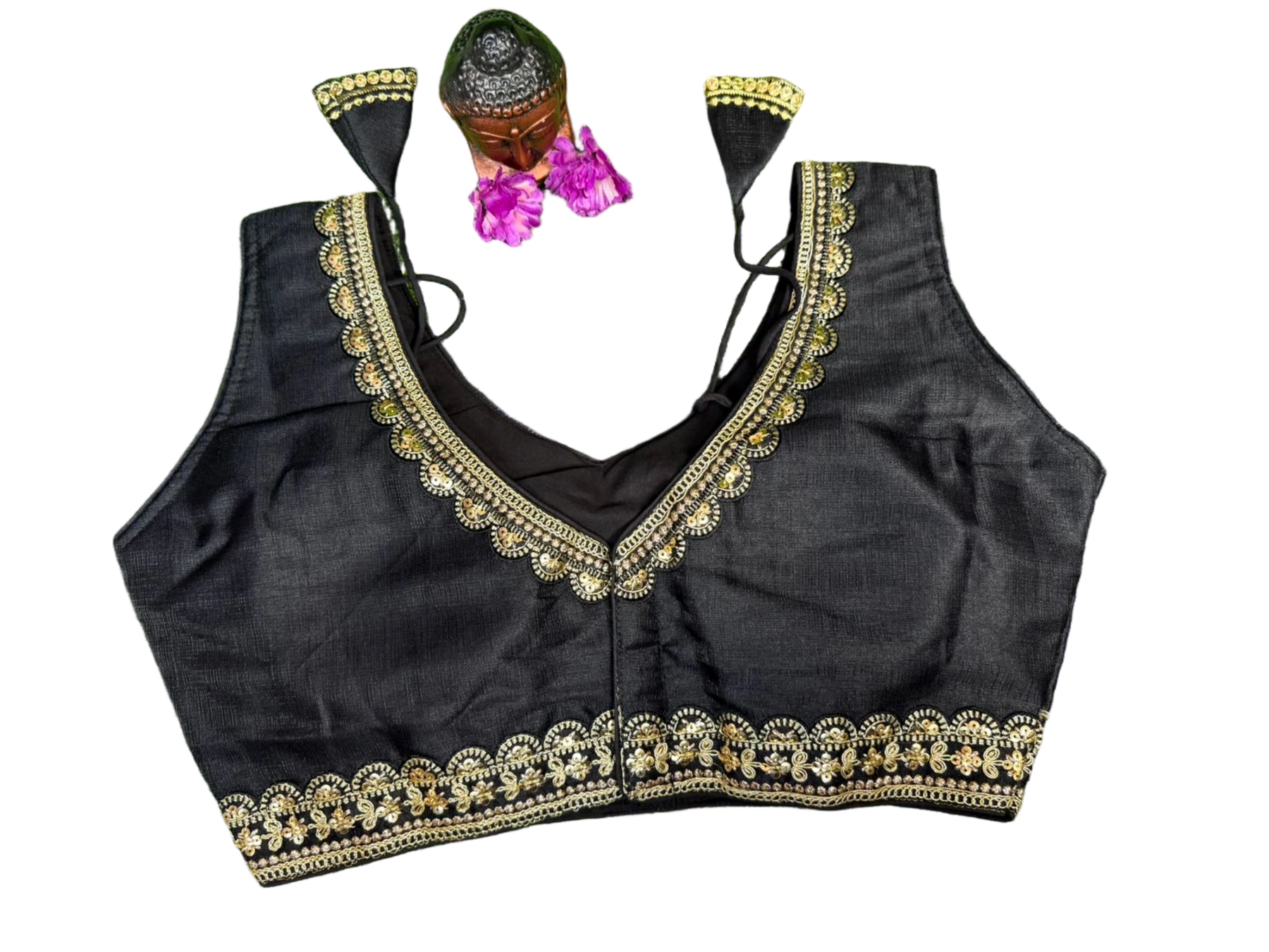 Description: This is a black sleeveless blouse with a V-neck and gold embroidery along the neckline and hem. It features a scalloped design and has decorative tassels at the shoulder straps