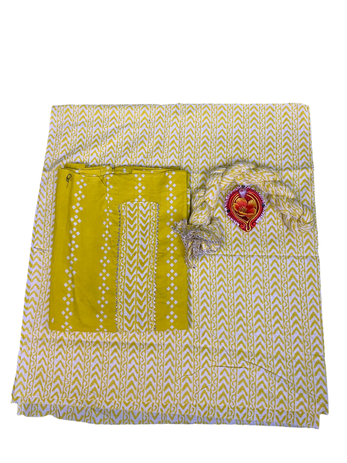 Description: This unstitched dress material features a yellow and white floral print and includes fabric for a kurta, bottom, and dupatta.