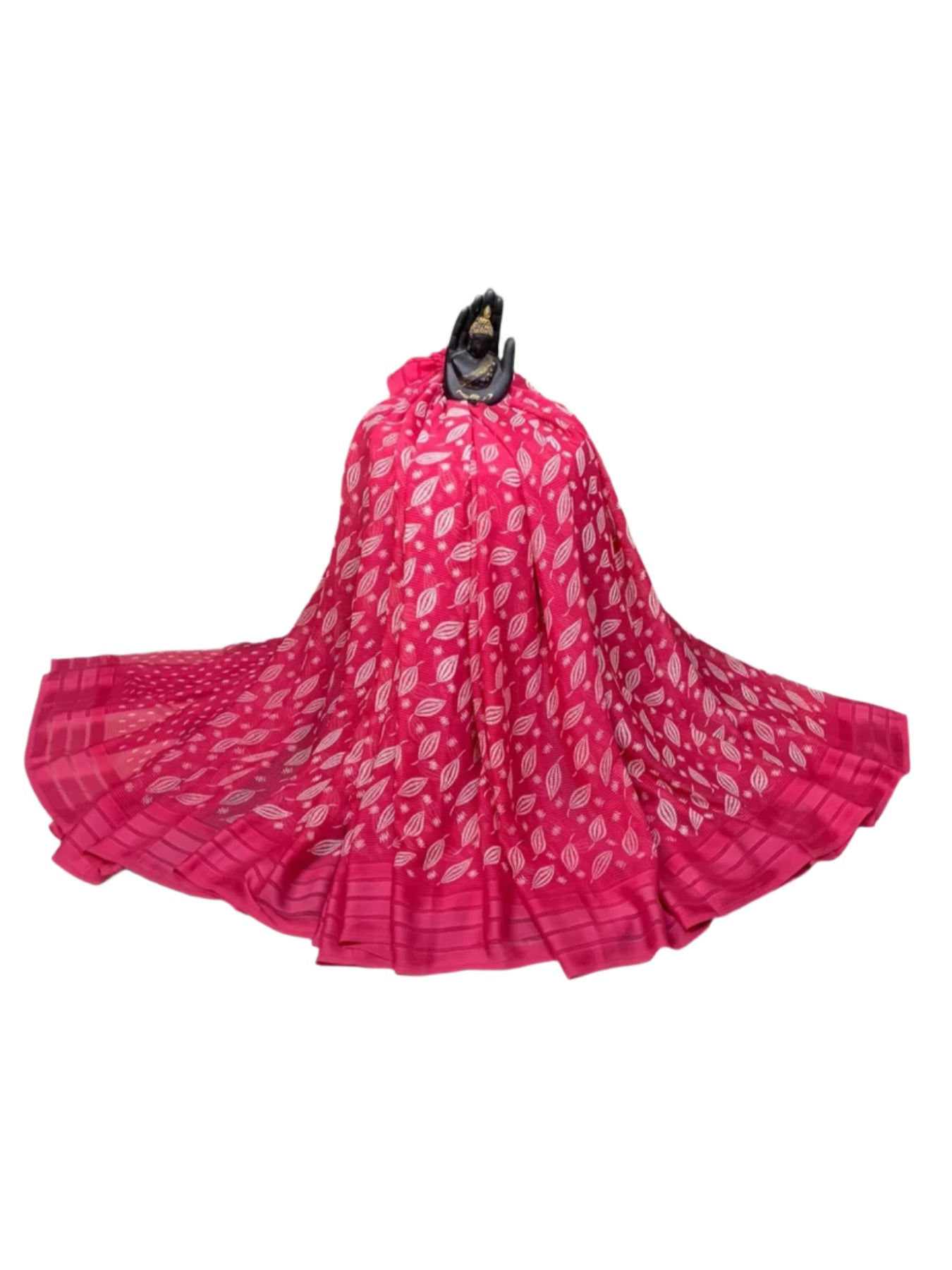 Description: This stunning saree is a vibrant shade of magenta pink, featuring an elegant leaf print all over. The saree has a delicate border, which adds a touch of sophistication to the overall design. The lightweight fabric drapes beautifully, making it perfect for special occasions and celebrations.