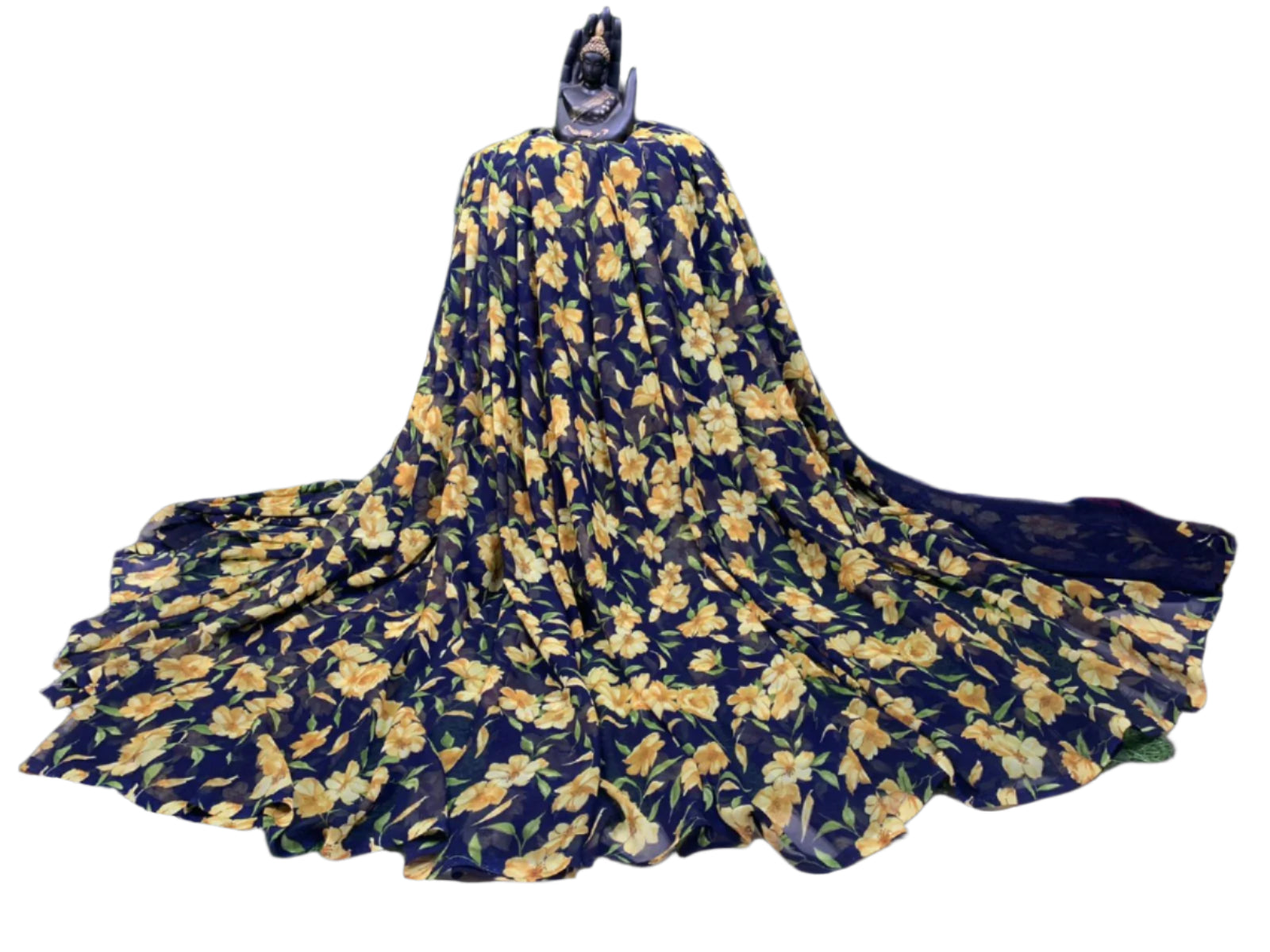 Description: This stunning daily wear saree features a navy blue base adorned with large, vibrant floral prints in white and yellow hues. The saree is likely made of a lightweight, flowy fabric like georgette or chiffon, making it comfortable for everyday wear. The pallu, or the end piece of the saree, has a contrasting border, adding a touch of elegance.
