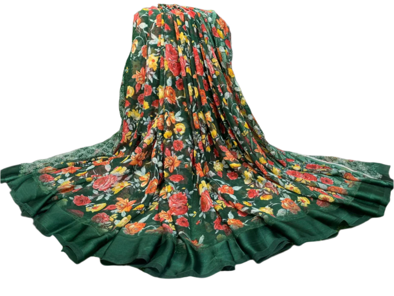 Description: This is a dark green floral printed saree. It seems to be made of a lightweight, flowy fabric, making it a comfortable choice for daily wear. The saree features a vibrant floral pattern in various colors, adding a touch of elegance to the overall look. The saree's border may have a contrasting design or a solid color that complements the floral pattern.
