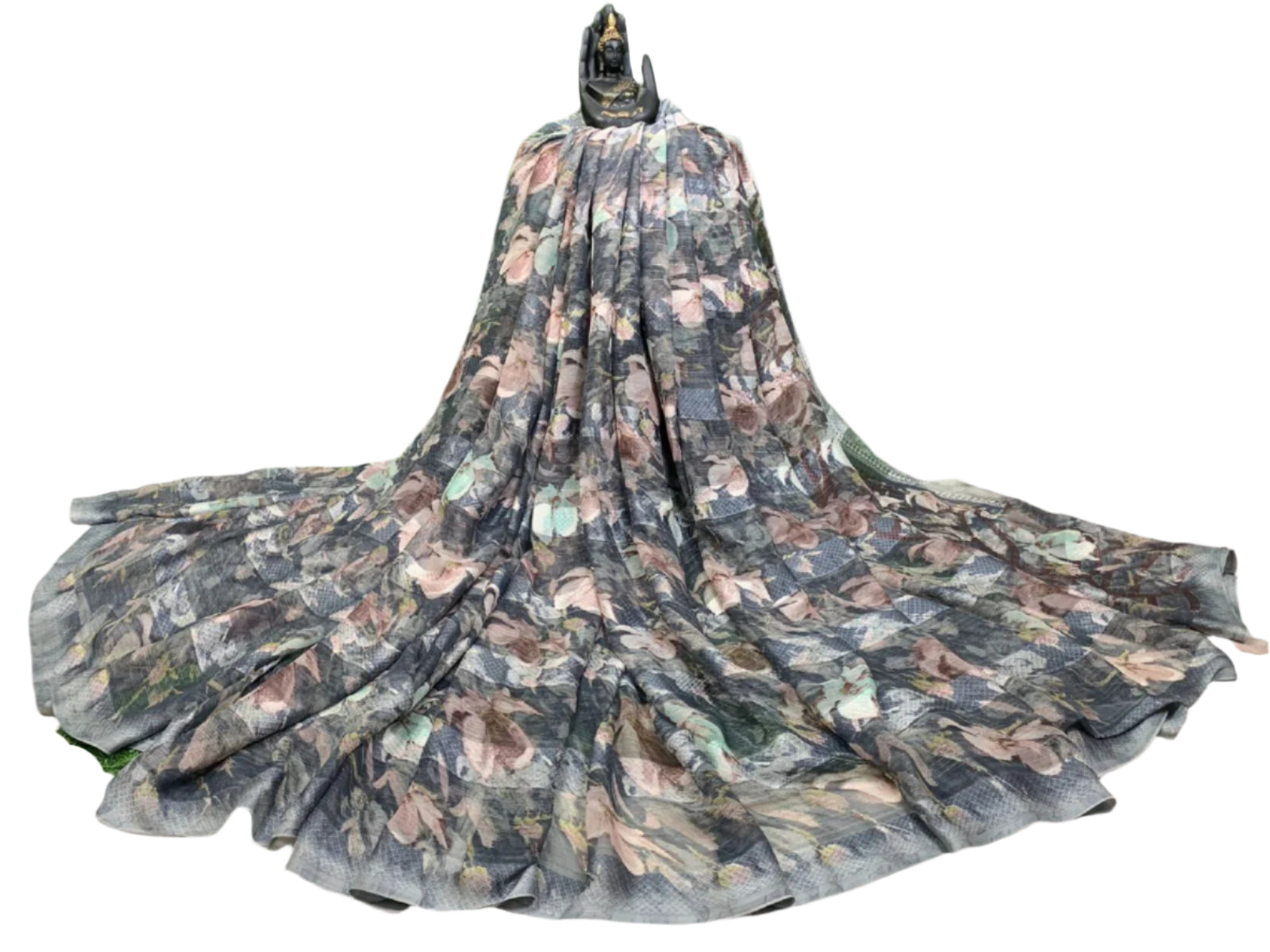 Description: This elegant, lightweight saree is perfect for daily wear. The fabric boasts a beautiful, watercolor-like floral pattern in shades of grey, and white, creating a dreamy and artistic effect. The saree is likely made of a soft, flowy material, such as chiffon or georgette, making it comfortable for all-day wear. It's a versatile piece that can be dressed up or down depending on the occasion.
