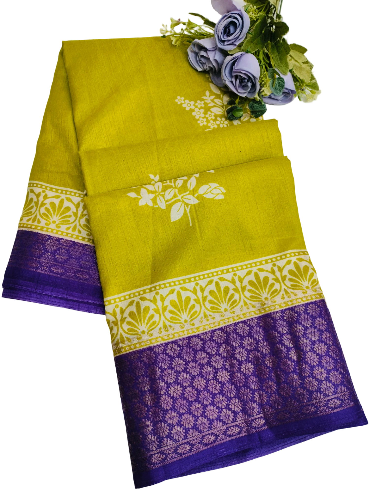 The saree features floral prints in white on the body.