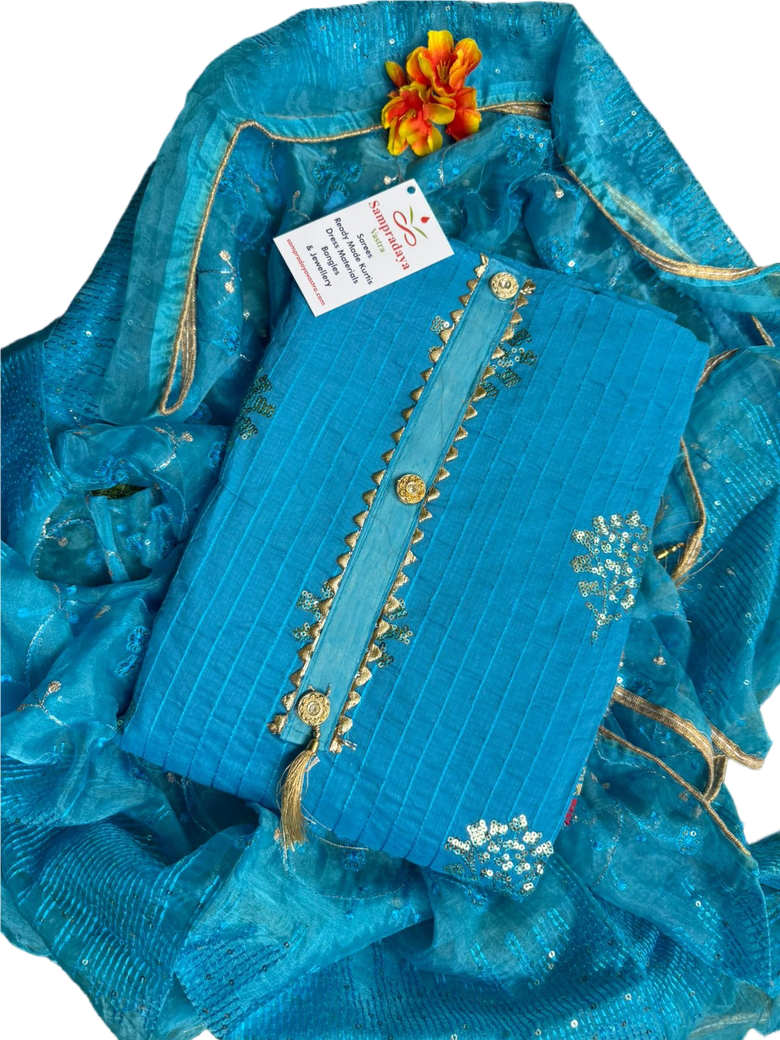 Description: This dress material features a vibrant blue chiffon fabric adorned with delicate floral prints. It includes a matching chiffon dupatta with a similar print and a solid blue bottom fabric, likely cotton or crepe. The top showcases intricate embroidery or embellishments, adding a touch of elegance to the ensemble.