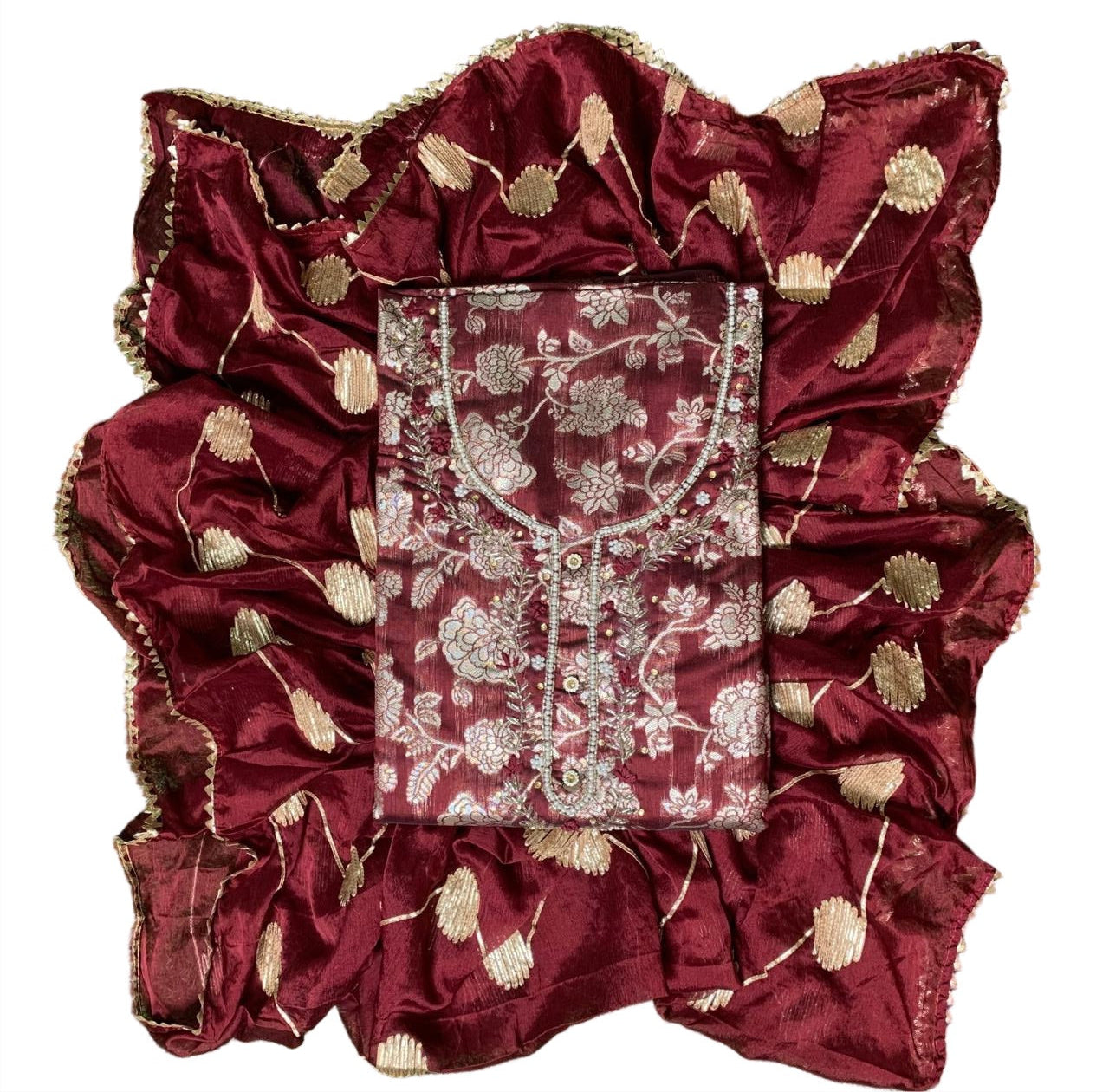 Description: This dress material features a rich, deep maroon chiffon fabric adorned with intricate silver embroidery, creating a luxurious and elegant look