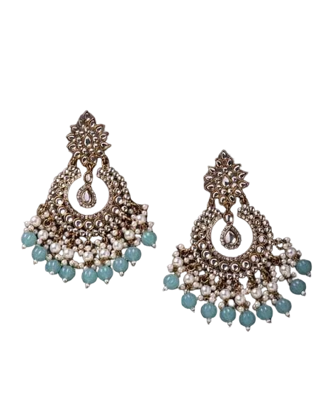 These earrings features an intricate, traditional Indian design. they are typically gold-plated and embellished with sparkling stones, such as kundan and small white pearls. The crescent shape is detailed with emboss detailing that adds depth and texture
