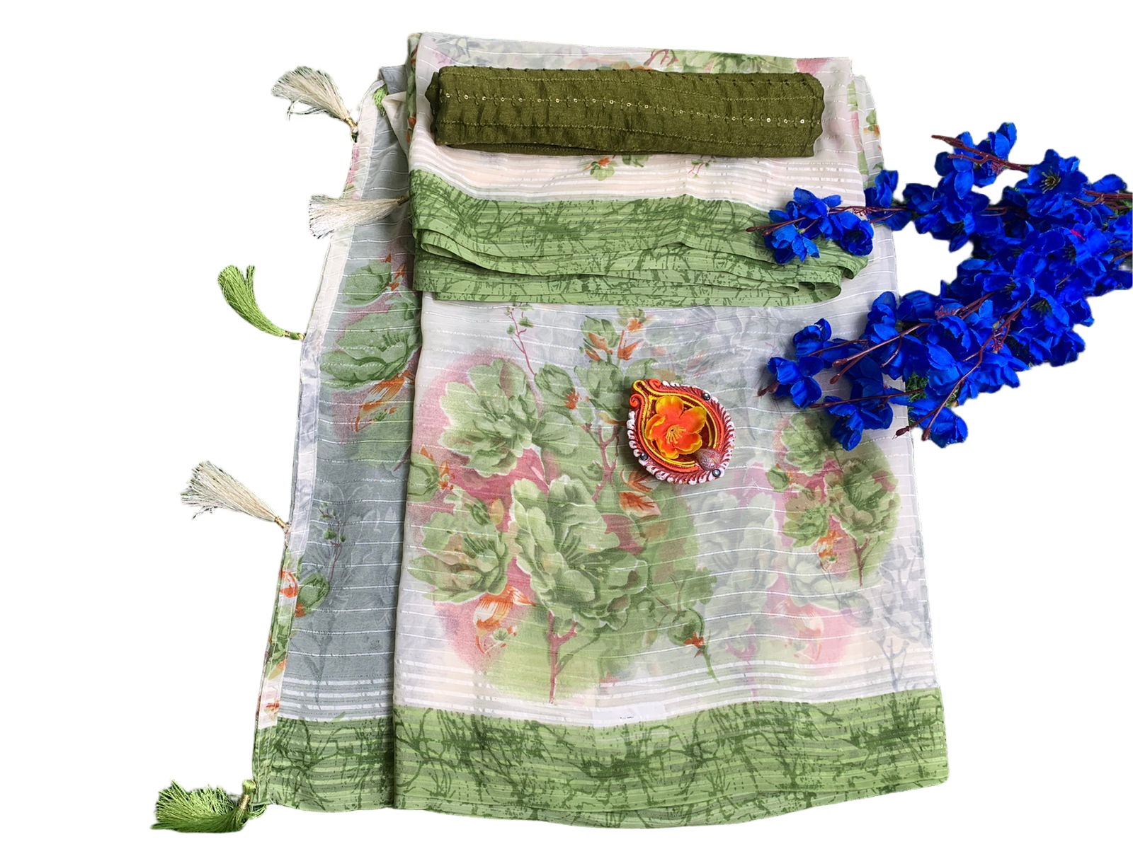 Description: This is a beautiful, lightweight saree with a floral print. The main body of the saree is a soft, off-white color and is adorned with delicate floral patterns in shades of pink and green. The saree features a contrasting green border along the top and bottom edges, adding a touch of vibrancy to the overall design. The pallu, the end piece of the saree that is typically draped over the shoulder, has a similar green pattern, enhancing the saree's elegance.