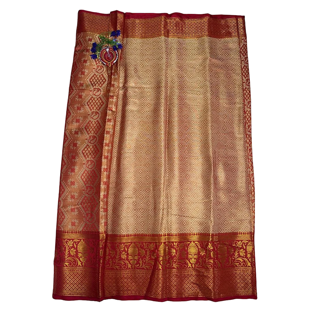Stunning Orange Glow This Saree Radiates Festive Warmth and Tarditional Charm. the body is adorned with Golden Zari Weaves, Featuring intricate Geometric and floral patterns that rich orange base. and the border stands out with its deep reddish - orange tint., enhanced by detailed Zari work. Saree Length 5.5 Mtrs, Blouse Piece : 1Cm.