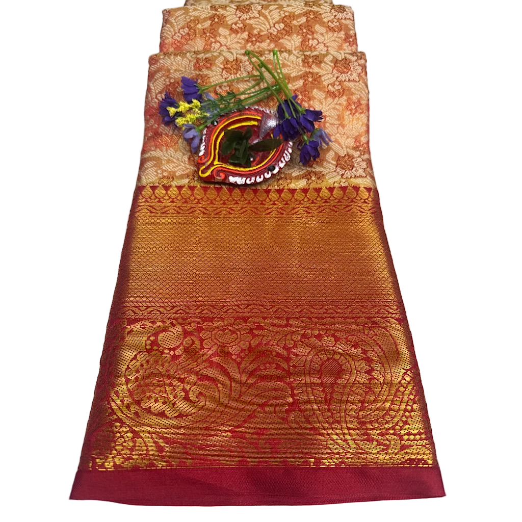 A rich orange Darmavaram Pattu Featuring Intricate Golden Zari Weaving all over the body. The saree Showcase Traditional Floral Motifs. and The border Contrasting Maroon Red with Intricate Zari Design. PALLU : Matching Orange enriched with rich Zari work. Fabric Feel : Soft, Glossy, amd perfect for festive & Traditional Occasions. Saree Lentgh 5.5 Mtrs. Blouse Piece : 1CM.