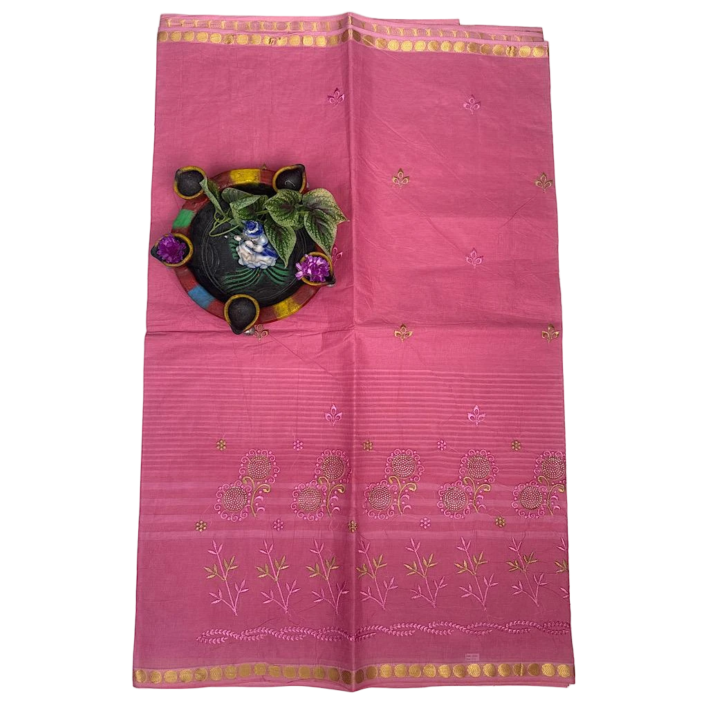This Elegant saree features a beautiful Palette of rose pink blending into soft mauve , Creating a graceful omber effect. the body is adorned with subtle woven floral vine motifs. Saree Length 5.5 Mtrsm, Blouse Piece 1CM .