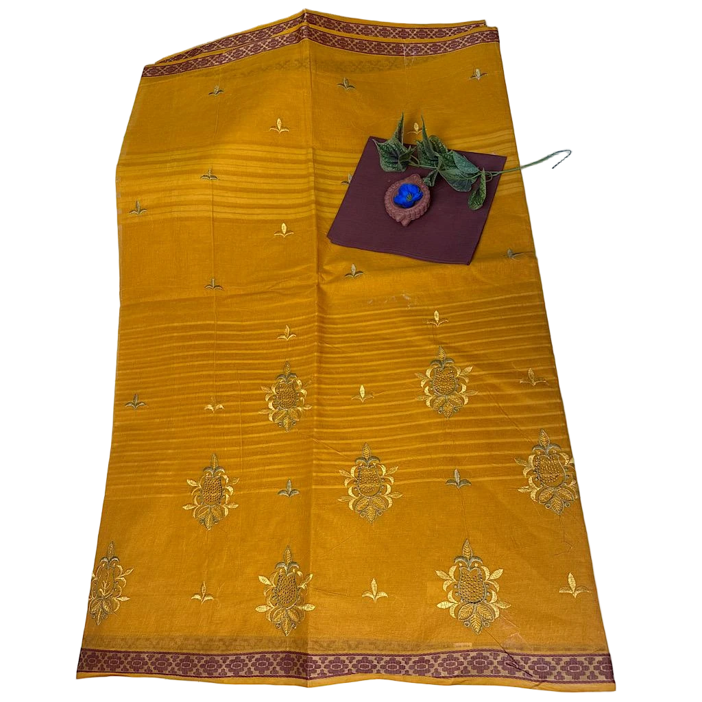 Primary Color is a Vibrant Mustard Yellow . it features Intricate golden zari work , Including Floral Motifs ( Buttas ) on the body and a distinct Border pattern.Blouse piece A contrasting Plain Brown Blouse Piece in Included with the saree. The fabric is lightweight, comfortable . and breathable making it suitblefor long wear. Saree Length 5.5 Mtrs . Blouse Piece 80cm.