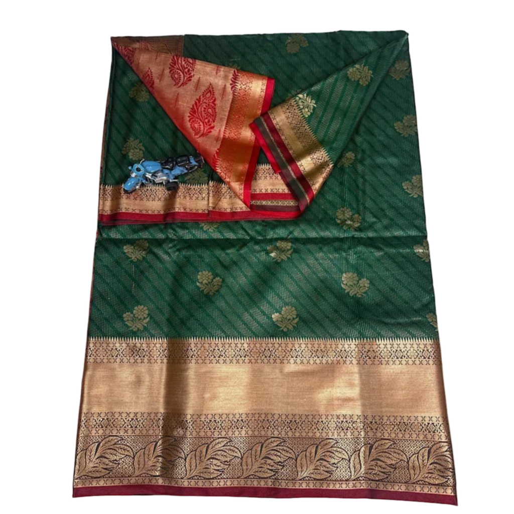 The saree features a rich Teal green body that brings warmth and vibrancy, beautifully contrasted with a soft silver zari pallu and border. The pallu is adorned with delicate woven floral motifs that add a touch of sophistication without being overpowering. A bright red accent border runs along the edges, enhancing the overall appeal and giving the saree a refreshing pop of color. The combination of Red, silver, creates a classic yet contemporary charm. Lightweight and smooth in texture, this saree drapes effortlessly and offers both comfort and elegance. with Blouse Piece , Saree length 5.5 Mtrs, Blouse piece: 1cm.