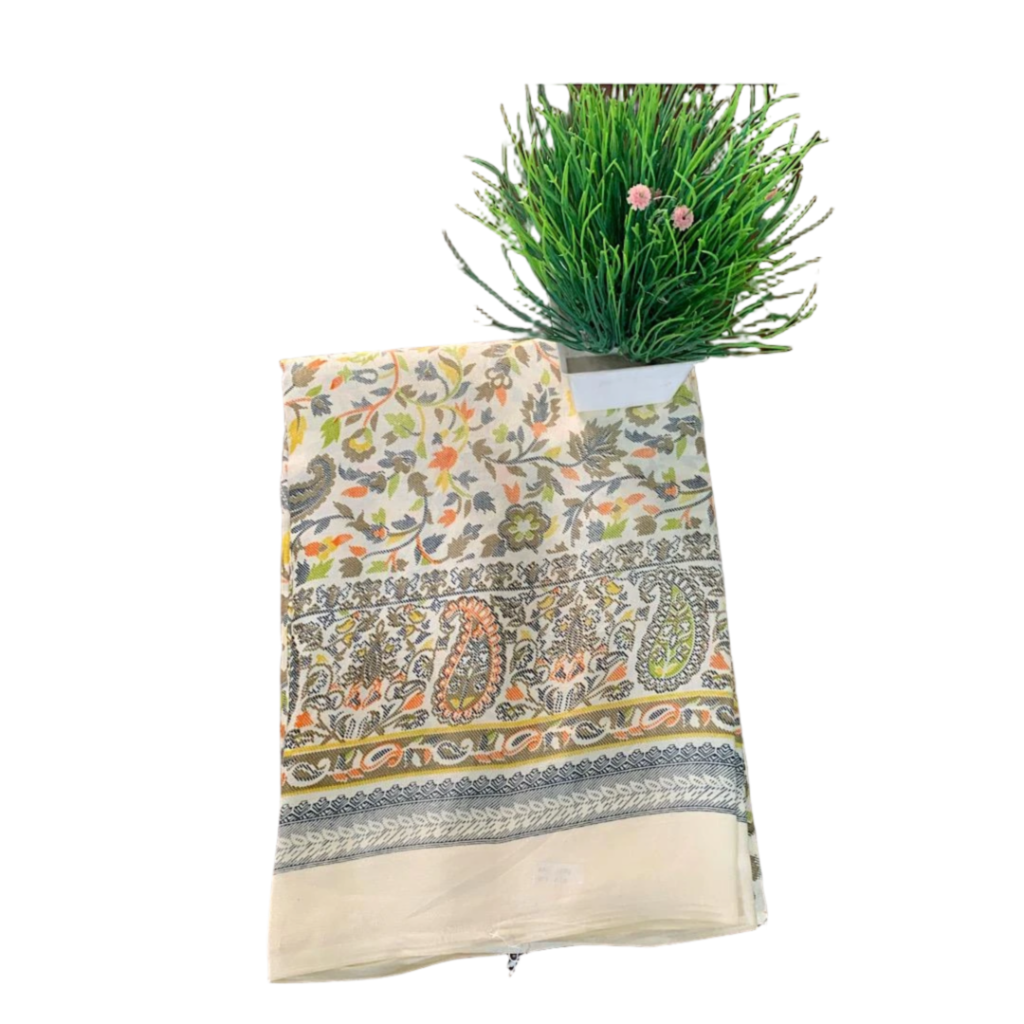 This charming ivory white saree is adorned with graceful floral and paisley prints in soothing shades of blue, grey, and hints of mustard, creating a fresh and elegant look. The saree features a beautifully coordinated printed border that enhances its refined appeal. Crafted from soft cotton silk, it offers a comfortable drape with a slight sheen, making it perfect for all-day wear. Ideal for office wear, casual outings, poojas, and daytime functions, this saree blends comfort with timeless style. Blouse Piece: