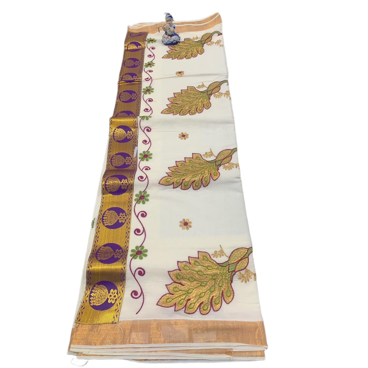 Mayura Pushpa Kerala saree is a graceful blend of tradition and elegance. It features a serene ivory white body adorned with delicate antique gold leaf (Pushpa) motifs, giving it a refined and timeless appeal. The highlight of the saree is its rich royal purple border, beautifully woven with gold Zari peacock (Mayura) motifs, symbolising grace and prosperity. Fine vine detailing along the border enhances the handcrafted charm, making this saree perfect for festive occasions, temple wear, and cultural gatherings. Matching Royal Purple blouse piece
