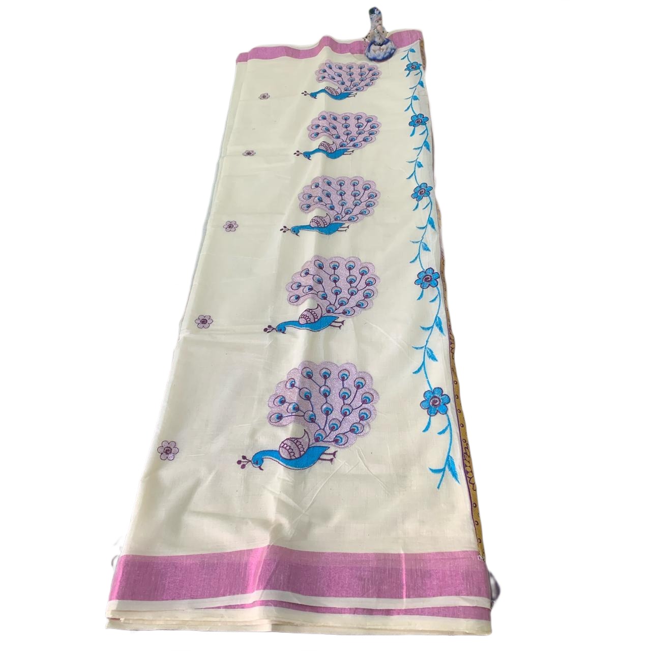Mayura Pushpa is a graceful pure Kerala Cotton saree featuring beautifully hand block–printed peacock motifs arranged in a vertical pattern. The serene ivory white base is enhanced with vibrant peacock blue detailing and a delicate floral vine border running along the pallu. Soft pink borders add a subtle contrast, giving the saree a refined and traditional charm. Lightweight, breathable, and comfortable, this saree is ideal for daily wear, office wear, temple visits, and casual ethnic occasions. Comes with a matching cotton blouse piece in coordinating ivory white with complementing border accents, perfect for a classic tailored look Saree length 5.5Mtrs , Blouse piece 1cm.