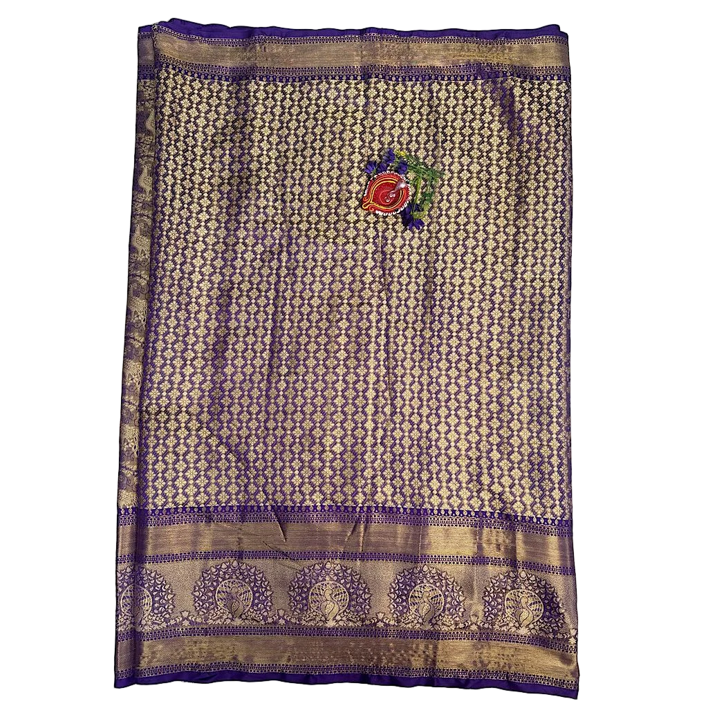 Silver-gray with all-over Floral and Traditional zari Weaving. and the border comes with a deep royal blue Zari border. Pallu : The pallu Showcase a grand Circular Motif in Silver Zari. Fabric : Smooth drape premium Pattu. Saree Lentgth 5.5 Mtrs. Blouse piece 1Cm.