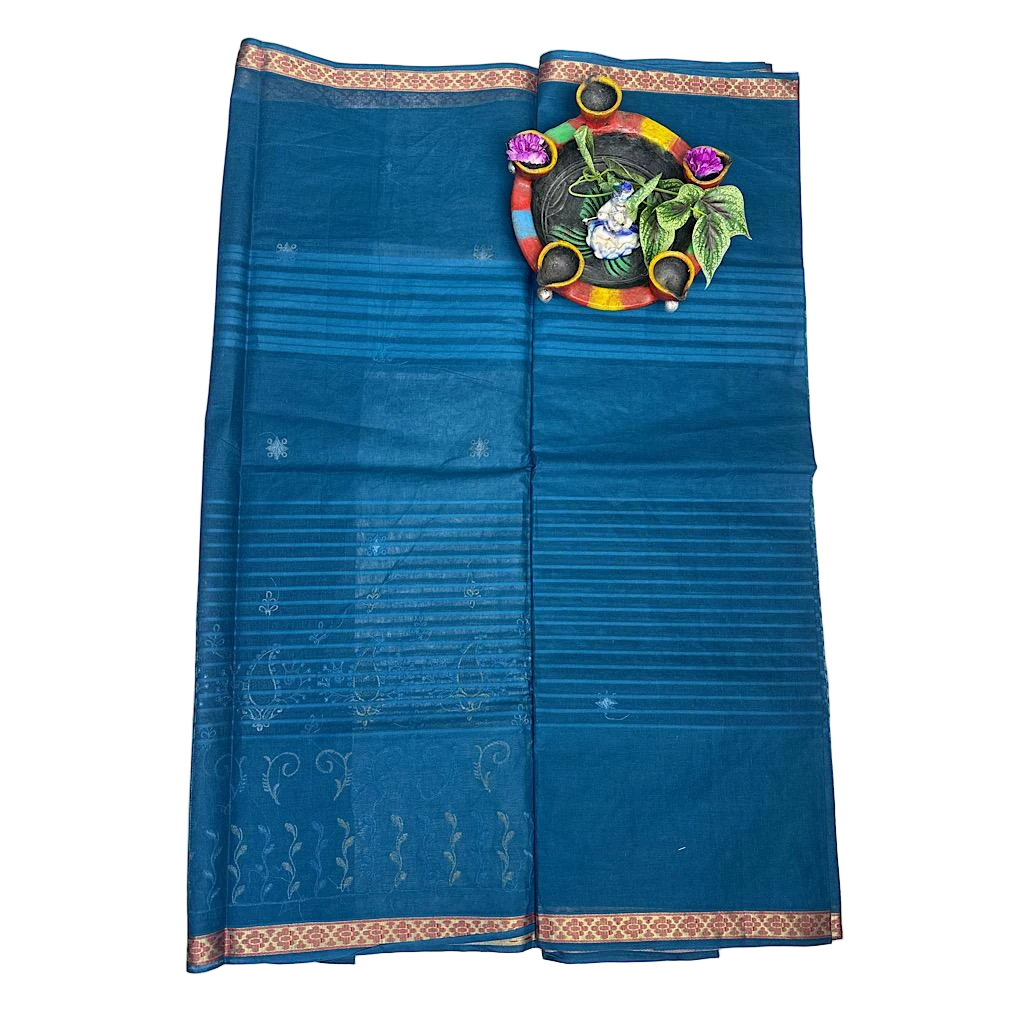 The neelambari Paisley Grace saree Flows in rich dual tone of sky blue and deep navy Highlighted with elegant paisley Motifs. and intricate thread work. the soft pink Border add a gentle Feminine Touch, Beautifully Balancing the bold blue palette. Saree Length 5.5 Mtrs. Blouse Piece1CM.