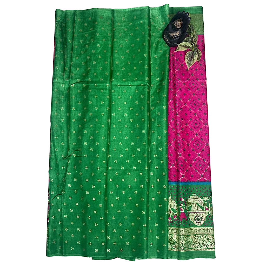 The Main Body of the saree ia a bright Megentha Hue, Adorned with small likely gold, Diamond Motifs woven the fabric. Border : Striking Feature is The Contrastig Green Border.This Border Features Elaborate Traditional Rathosthava Motifs. and the pallu is the same Green color as the Border. Saree Length 5.5 Mtrs Blouse Piece :1CM.