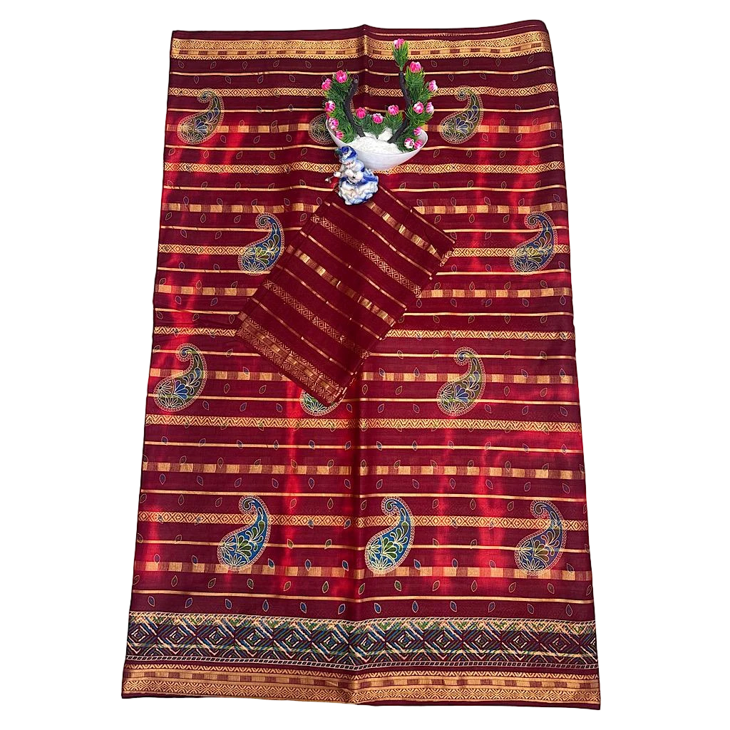The Saree Body adorned with elegant Blue and Reddish Paisley Motifs. The Border Showcase Intricate Geometric Designs. The Saree Comes with a ,Matching Maroon Blouse Piece Featuring Small Woven Patterns. Saree Length 5.5 Mtrs . Blouse Piece 1CM.