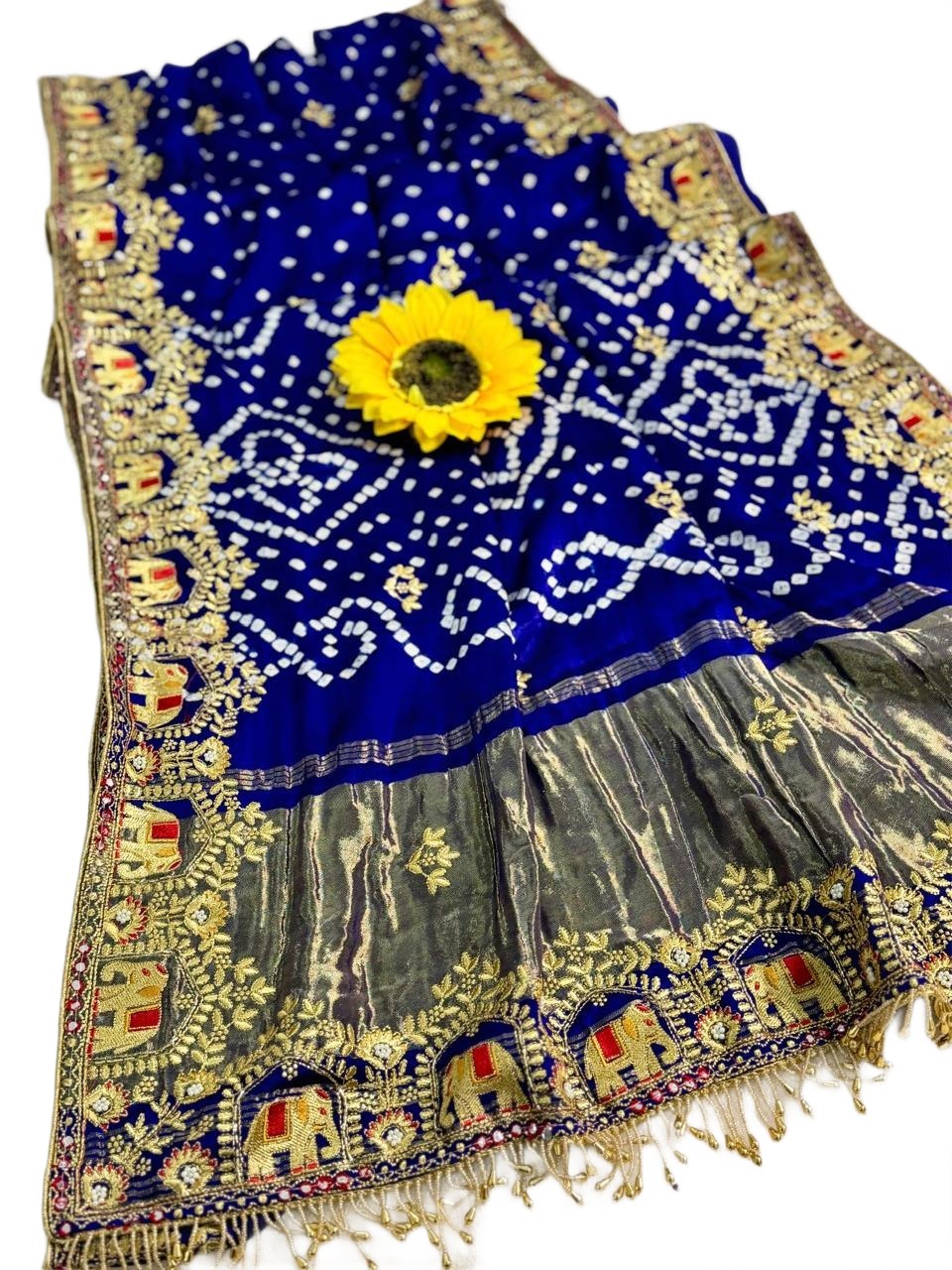 Beautiful saree showcases a rich emerald Blue base adorned with classic Bandani-inspired dotted patterns and delicate floral motifs, giving it a traditional yet refreshing appeal. The saree is enhanced with an elegant beige border featuring intricate multi colour designs that add a graceful contrast.The pallu comes in a soft off-white tone with Original Lagdi Patta with Hand Work