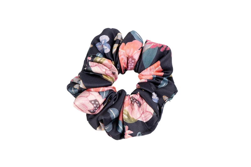 This is a hair scrunchie made of a soft, likely satin or silk-like, fabric. It features a gathered design with an elastic core to hold hair securely.