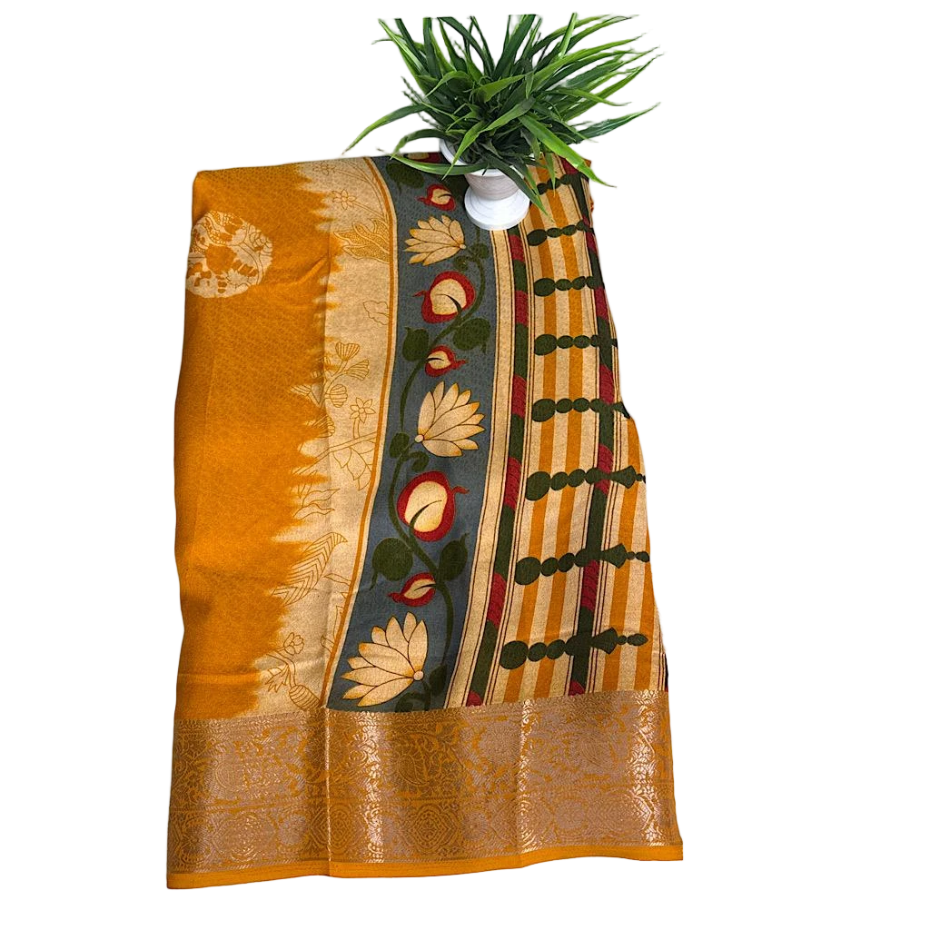 The Suvarna Vana Saree is a celebration of earthy elegance and handcrafted beauty. Featuring a luminous golden-mustard base, this saree is enhanced with intricate floral and vine motifs in soothing teal blue and rust red tones, paired with a striking striped border. Crafted in a cotton-silk blend, it offers both comfort and a subtle festive glow. Perfect for cultural gatherings, day functions, and graceful festive wear, this saree brings tradition and artistry together in a timeless silhouette.Includes a matching blouse piece in coordinated mustard and stripe patterns, designed to complement the saree’s artistic borders. saree length 5.5 mtrs , Blouse piece 1 cm
