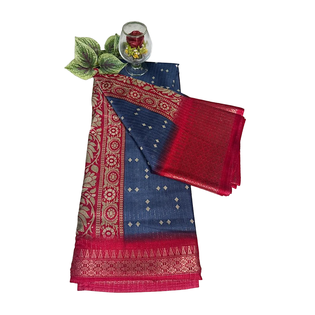 A Geaceful Blue Cotton Silk Saree Adorned with Delicate Dotted Motifs and Contrasted by a rich pink Jacquard Woven Border. Elegant , breathbale , and perfect for daily wear, office and Small Festive Occassions. Saree Length 5.5Mtrs , Blouse Piece 80CM